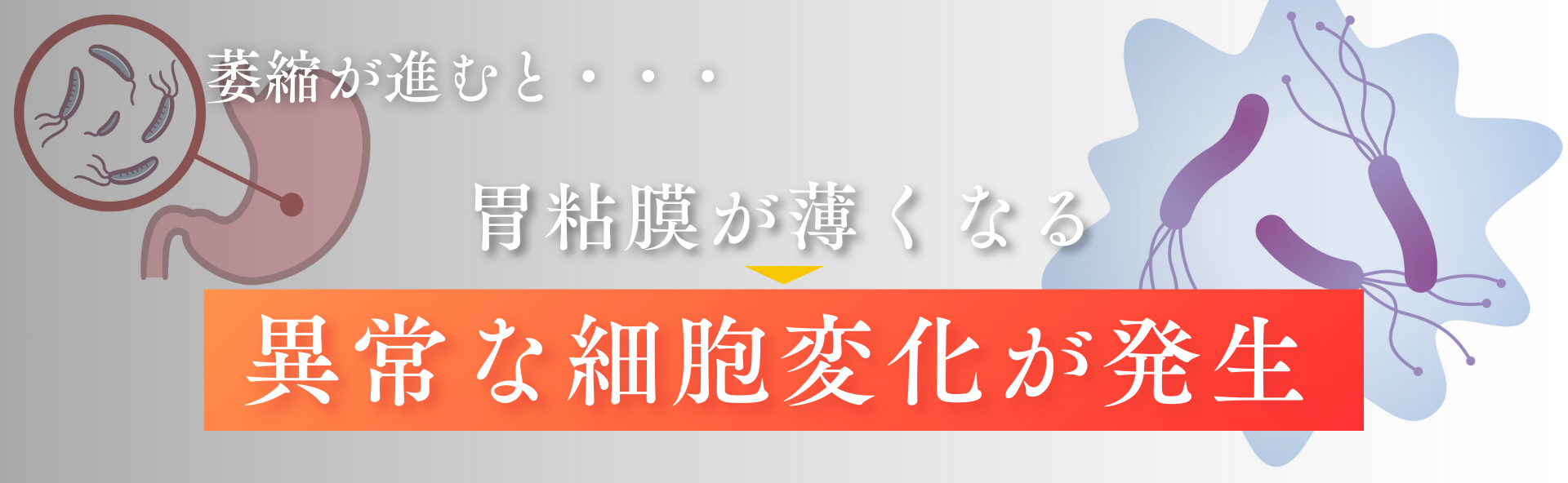 ヘリコバクター・ピロリ菌は、胃の粘膜に生息し、持続的な炎症を引き起こすことで萎縮性胃炎の発症や進行に強く関係します。ピロリ菌に感染すると、胃粘膜が防御力を失って傷つきやすくなり、長く放置すると萎縮性胃炎から胃がんへとつながる可能性が高まります。
