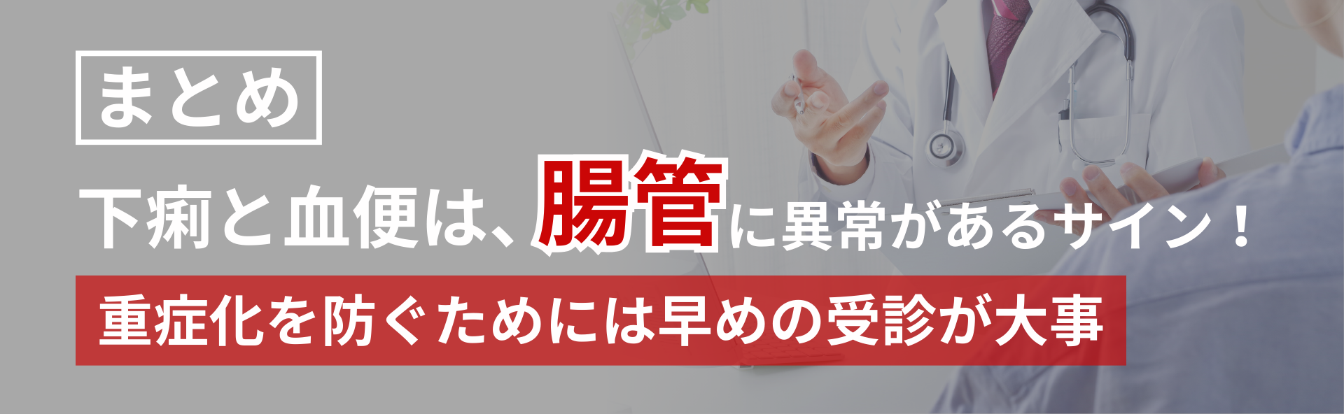 早期受診によって、重篤な疾患の早期発見・早期治療につなげることができるため、下痢と血便が同時に起こる症状が見られた場合は放置せず、できるだけ早く消化器内科を受診しましょう。