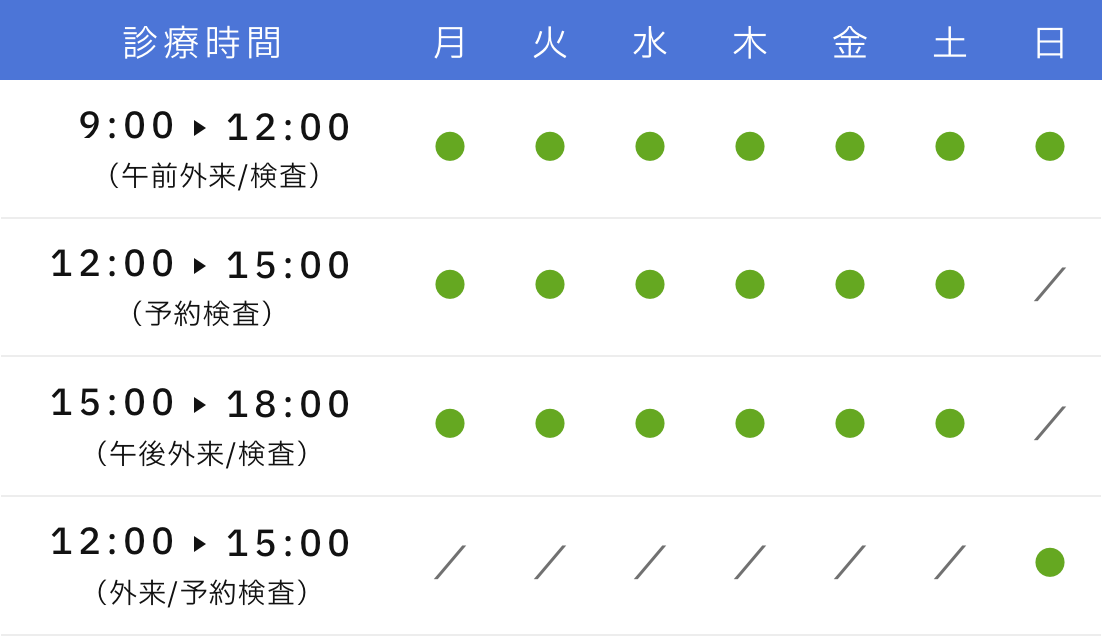 忙しい方にも安心して受けていただけるよう、土曜・日曜も診療・検査を実施しています。
